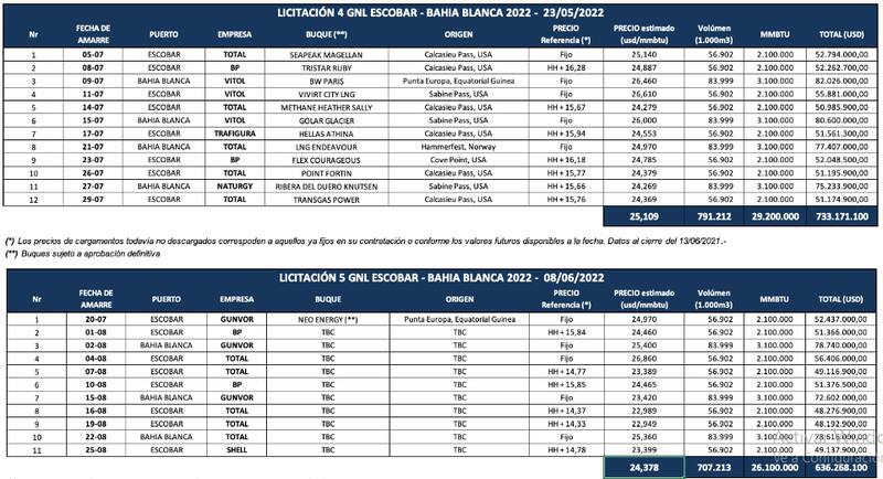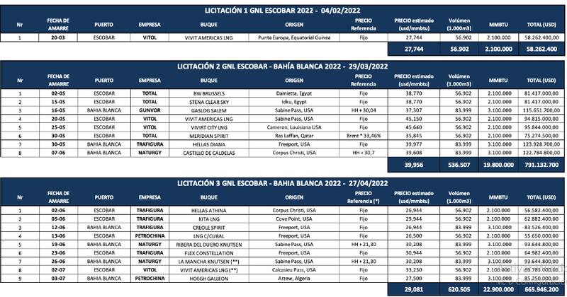 El costo promedio de importaciones en 2021 fue de u$s 8,33 y el total rondó los u$s 1100 millones; para 2022, las compras llegan a casi u$s 2900 millones a un promedio de u$s 28,82 por millón de BTU.