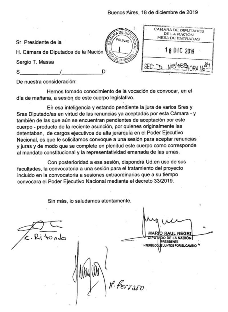 Mientras se llevaban adelante estas negociaciones en el Anexo C, de las que el Interbloque Juntos por el Cambio ni siquiera se involucró, porque ya tenía resuelto que emitiría un dictamen en minoría, que sumó 35 firmas, los líderes de la bancada, Cristian Ritondo (Pro), Mario Negri (UCR) y Maximiliano Ferraro (CC) le enviaron una misiva al presidente de la Cámara, Sergio Massa, pidiéndole que desdoblara la sesión. Así, la principal bancada opositora podría dar quórum en aquella destinada únicamente a la jura de la veintena de diputados; y no darlo en la sesión para tratar la Ley de Solidaridad Social.