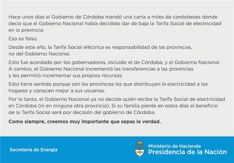 Y remató: Por lo tanto, el Gobierno nacional ya no decide quién recibe la Tarifa Social de electricidad en Córdoba (ni en ninguna otra provincia). Si su familia pierde en estos días el beneficio de la Tarifa Social será por decisión del gobierno de Córdoba".