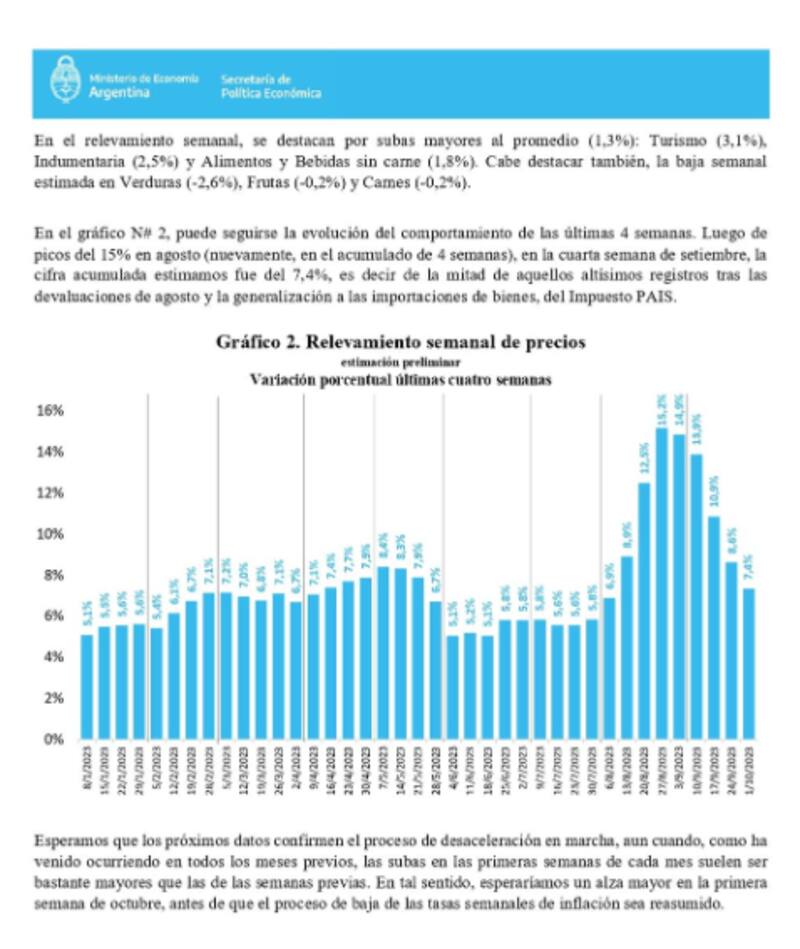 Atentos a esta situación desde Economía advirtieron que "esperaríamos un alza mayor en la primera semana de octubre antes de que el proceso de baja de las tasas semanales de inflación sea reasumido".