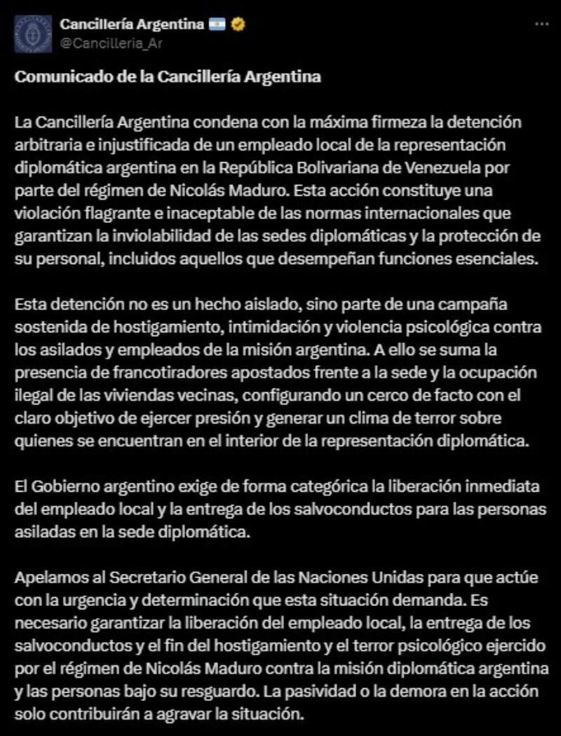 "Apelamos al Secretario General de las Naciones Unidas para que actúe con la urgencia y determinación que esta situación demanda. Es necesario garantizar la liberación del empleado local, la entrega de los salvoconductos y el fin del hostigamiento y el terror psicológico ejercido por el régimen de Nicolás Maduro contra la misión diplomática argentina y las personas bajo su resguardo. La pasividad o la demora en la acción solo contribuirán a agravar la situación", advirtieron.