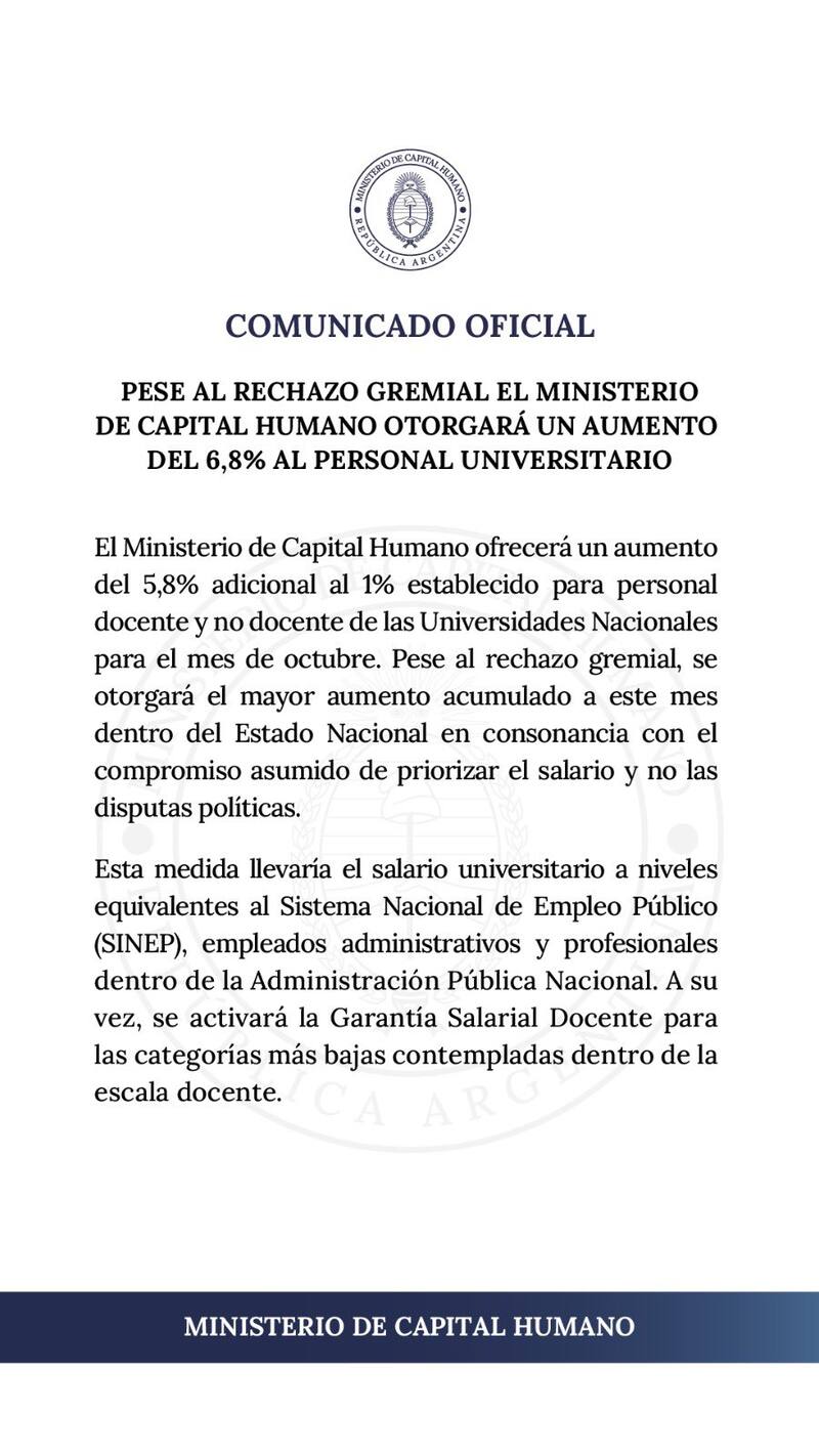 El comunicado señala que el aumento será desglosado de la siguiente manera: "5,8% adicional al 1% establecido para personal docente y no docente de las Universidades Nacionales para el mes de octubre".