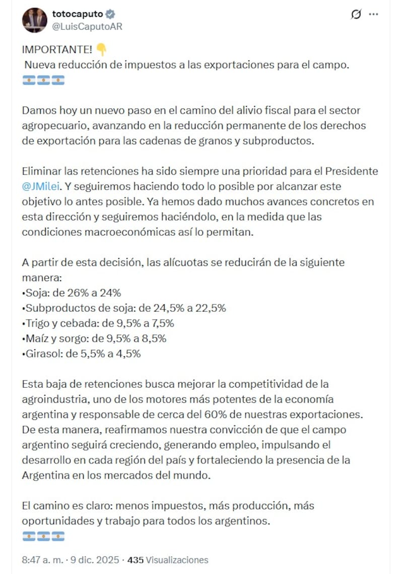 “Damos hoy un nuevo paso en el camino del alivio fiscal para el sector agropecuario, avanzando en la reducción permanente de los derechos de exportación para las cadenas de granos y subproductos”, publicó en su cuenta de X.