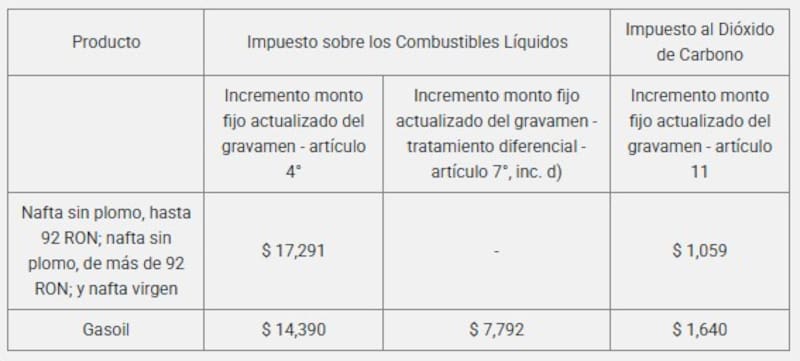En el caso del gasoil, la suba es de $ 14,390 por litro para el impuesto sobre los combustibles líquidos, de $ 7,792 por litro para el tratamiento diferencial previsto para algunas regiones del país, y de $ 1,640 por litro en el gravamen de carbono.
