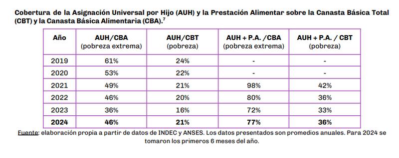 En paralelo, la Asociación Civil por la Igualdad y la Justicia (ACIJ) informó que la asignación universal por hijo (AUH) y la prestación Alimentar alcanzaron a cubrir el 77% de la canasta básica alimentaria en los primeros 6 meses del año. Si bien esto representó un incremento respecto del promedio que reflejaron en 2023, se mantiene lejos de la cobertura que tenían en 2021, cuando abarcaban el 98% de la canasta.
