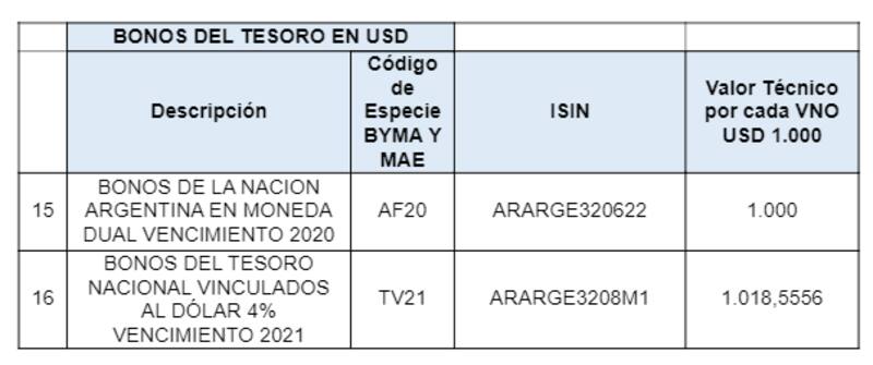 El valor técnico a tomar por cada título para el canje oscila entre u$s 600 cada u$s 1000 nominales y u$s 850 cada u$s 1000 nominales para las emitidas durante el gobierno de Mauricio Macri, y de u$s 1000 cada u$s 1000 nominales para las que fueron lanzadas desde diciembre.