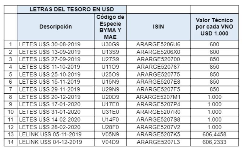 La licitación se realizará el viernes, entre las 10 y las 15 y será por adhesión, con un tramo único para cada uno de las 12 Letras del Tesoro (Letes), las dos series de Lelink y de los dos bonos a convertir. En tanto, la liquidación de las operaciones será el miércoles 22.