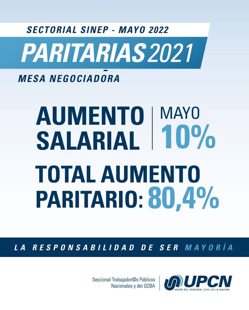 El resto del convenio colectivo general recibe un incremento del 64%. Un punto importante es que la paritaria va de junio a mayo, "de esta manera quedamos un 3% por encima de la inflación junio 2021 a mayo 2022", explicó una fuente de UPCN.
