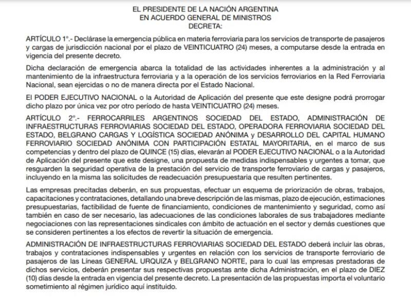 El Gobierno decretó la emergencia pública en materia ferroviaria por un período de 24 meses. Esta medida, anunciada a través del Boletín Oficial, tiene como objetivo "resguardar la seguridad operativa de la prestación del servicio de transporte ferroviario de cargas y pasajeros". La declaración de emergencia abarca todas las actividades relacionadas con la administración, mantenimiento y operación de la infraestructura ferroviaria en la Red Ferroviaria Nacional.