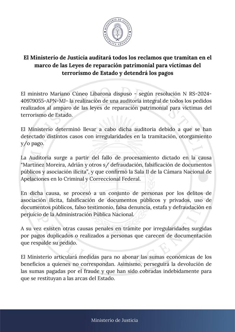 La cartera que conduce Libarona dispuso "la realización de una auditoría integral de todos los pedidos realizados al amparo de las leyes de reparación patrimonial para víctimas del terrorismo de Estado" en la resolución N RS-2024-40979055-APN-MJ-, por lo que se investigaría la entrega de dinero.