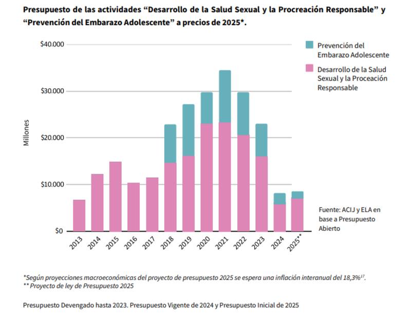 De un análisis realizado por la organización ELA y la Asociación Civil por la Igualdad y la Justicia (ACIJ), el presupuesto para el año próximo recorta en el27% real los fondos destinados al Plan Nacional de Prevención del Embarazo No Intencional en la Adolescencia (Plan ENIA) contra 2024, año en el que los fondos ya habían sido ajustados en un 64% contra 2023. En 2025 los fondos serán 78% inferiores a los de 2023.
