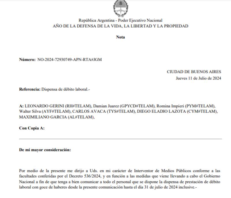 La decision fue oficializada por el interventor de RTA, empresa que agrupaba históricamente a Radio Nacional y la TV pública, pero que ahora absorbió a las dos empresas en las que se reconvirtió Telam. Lo hizo a través de una nota donde se informa lo siguiente: "Por medio de la presente me dirijo a Uds. en mi carácter de Interventor de Medios Públicos conforme a las facultades conferidas por el Decreto 536/2024, y en función a las medidas que viene llevando a cabo el Gobierno Nacional a fin de que tenga a bien comunicar a todo el personal que se dispone la dispensa de prestación de débito laboral con goce de haberes desde la presente comunicación hasta el día 31 de julio de 2024 inclusive". Aunque la nota no lo menciona, El Cronista pudo saber que, además, la intervención tiene la intención de abrir nuevos retiros voluntarios, adicionales a los que ya ofreció cuando eran personal de Telam.