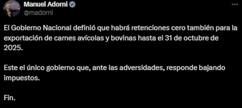 A través de redes sociales, el vocero de Presidencia, Manuel Adorni, anunció que el Gobierno quitará las retenciones a la exportación de carnes avícolas y bovinas hasta el 31 de octubre de 2025.