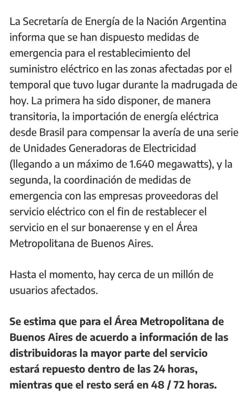En este contexto, miles de usuarios sufrieron el corte del servicio eléctrico, que aún no se restauró en su totalidad. Para ello, la Secretaría de Energía informó que importará energía desde Brasil para restituir el suministro en el AMBA, área que integra Capital Federal y el conurbano bonaerense.