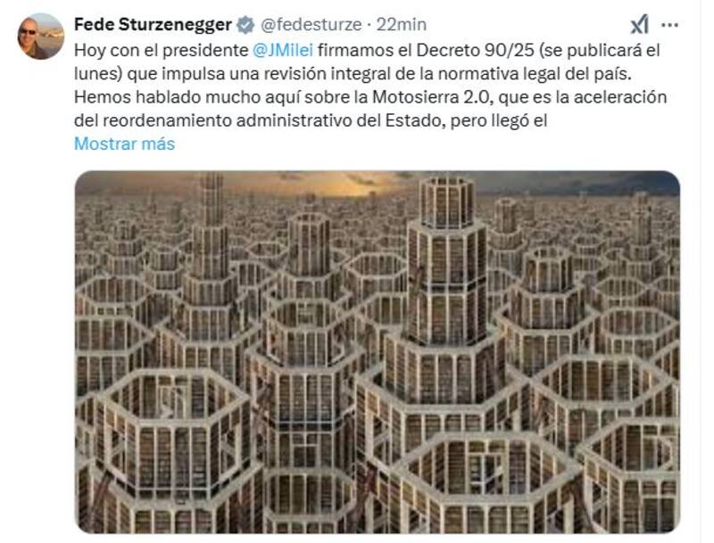 En ese sentido, minutos después, el ministro Sturzenegger compartió algunos detalles en sus redes sociales. "Firmamos el Decreto 90/25 (se publicará el lunes) que impulsa una revisión integral de la normativa legal del país", precisó.