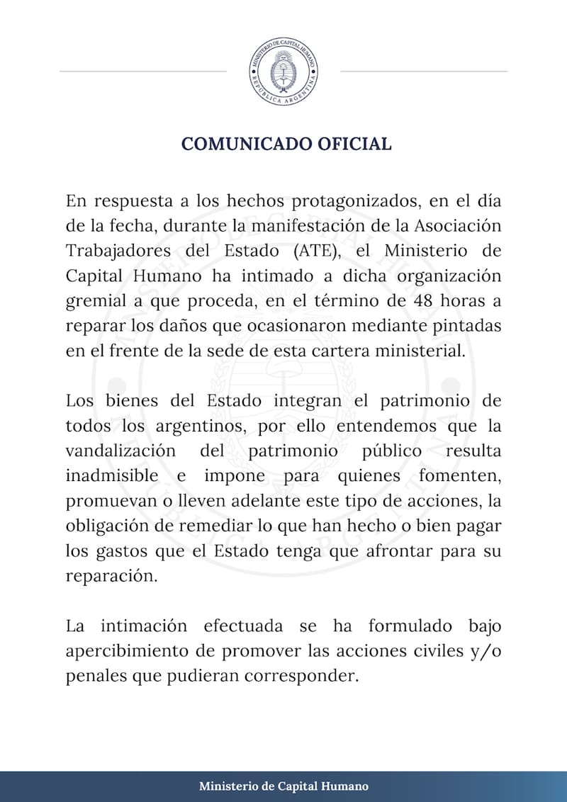 El gobierno de Javier Milei, a través del Ministerio de Capital Humano que conduce Sandra Pettovello, intimó a ATEluego de que más temprano se produjeran fuertes incidentes entre Prefectura y manifestantes de la asociación frente a la sede de la cartera.