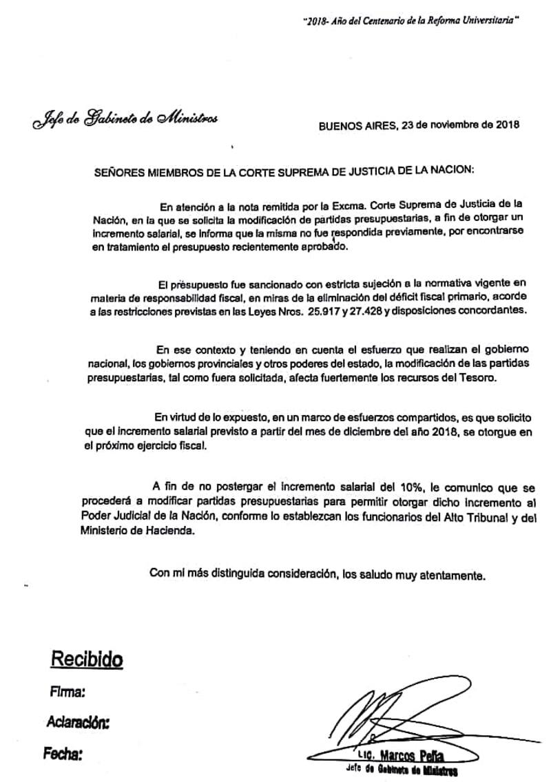 En una carta fechada el 23 de noviembre, y con firma del jefe de Gabinete, Marcos Peña, se explicó: "En un marco de esfuerzos compartidos, es que solicito que el incremento salarial previsto a partir del mes de diciembre de 2018, se otorgue en el próximo ejercicio fiscal". Previamente, la carta hacía alusión a la eliminación del déficit fiscal primario, tal como lo establece el Presupuesto 2019 sancionado en el Congreso de la Nación.