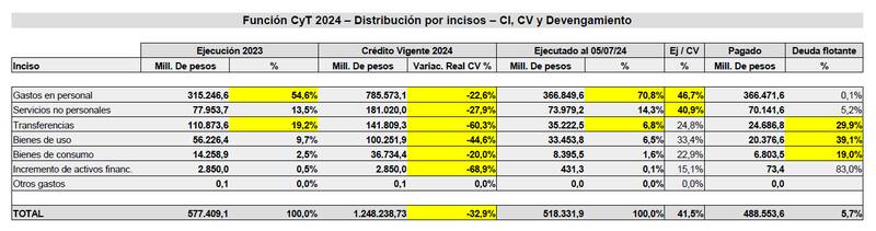 En este sentido, respecto del sector científico, la proyección anual del Crédito Vigente (CV) de la Función Ciencia y Técnica (FCyT) muestra un deterioro del 32,9% real, cayendo en todos los objetos de gasto. Se destacan las retracciones del inciso salarial (-22,6% real), gastos de capital (-44,6%) y transferencias (-60,3%).