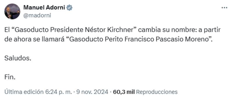 "El 'Gasoducto Presidente Néstor Kirchner' cambia su nombre: a partir de ahora se llamará 'Gasoducto Perito Francisco Pascasio Moreno'. Saludos. Fin", fue el mensaje que publicó el vocero presidencial Manuel Adorni en su perfil de la red social X (ex Twitter).