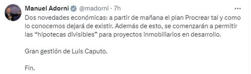 El vocero presidencial, Manuel Adorni, había adelantado a través de su cuenta de X, la decisión del Ejecutivo el lunes por la noche. "Dos novedades económicas: a partir de mañana el plan Procrear tal y como lo conocemos, dejará de existir", escribió.