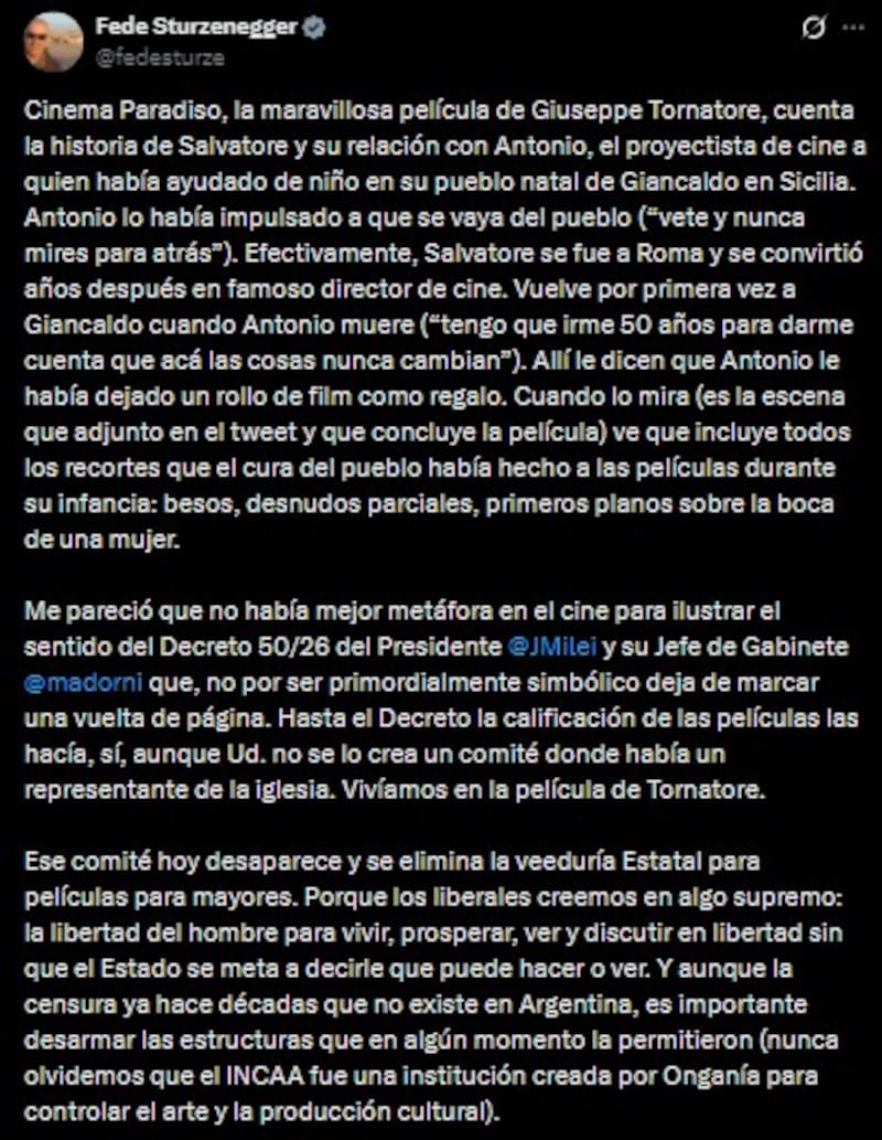 Tras esto, el ministro de Desregulación, Federico Sturzenegger, publicó un tuit al respecto con referencias al cine. Allí, destacó la medida como “una vuelta de página” en el vínculo del Estado con la cultura.