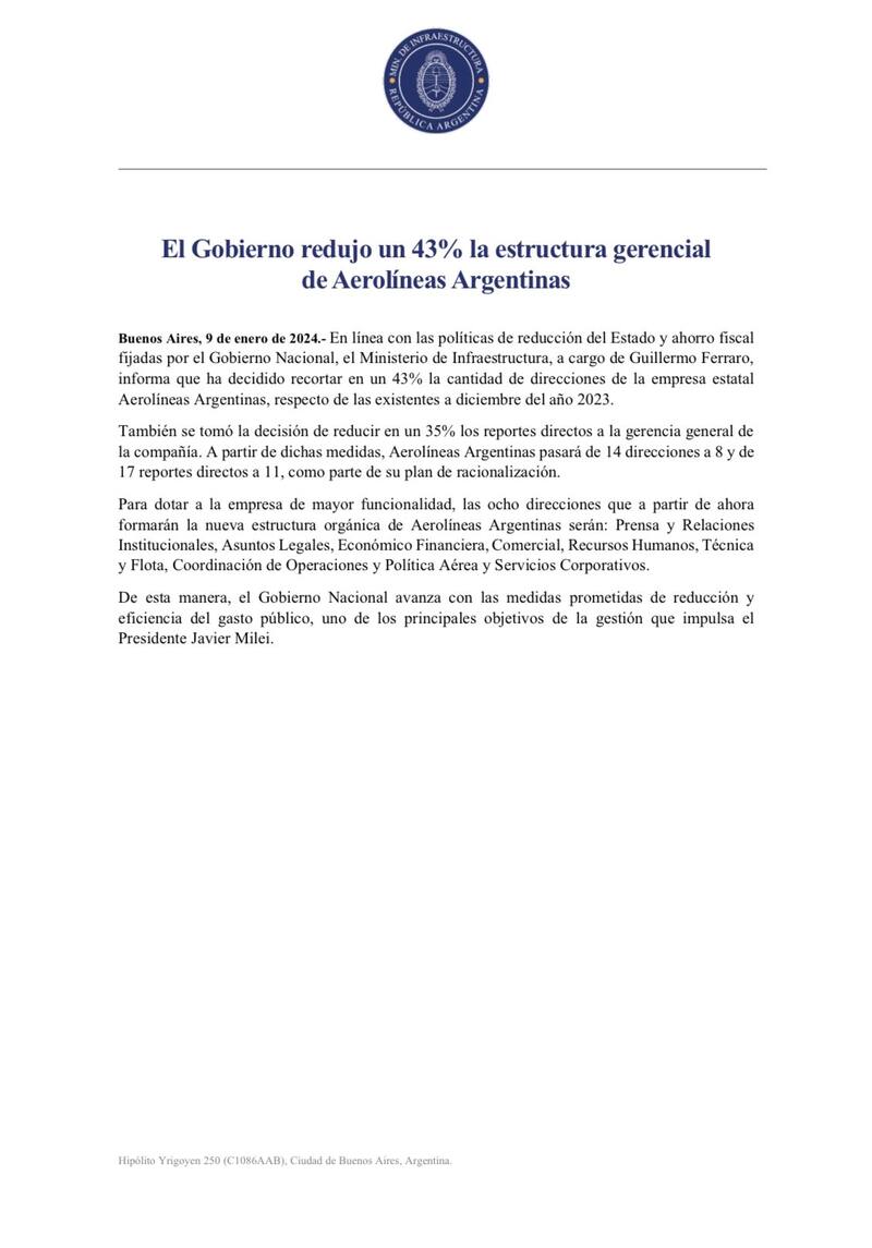 "Para dotar a la empresa de mayor funcionalidad, las ocho direcciones que a partir de ahora formarán la nueva estructura orgánica de Aerolíneas Argentinas serán: Prensa y Relaciones Institucionales, Asuntos Legales, Económico Financiera, Comercial, Recursos Humanos, Técnica y Flota, Coordinación de Operaciones y Política Aérea y Servicios Corporativos", se detalla en el comunicado.
