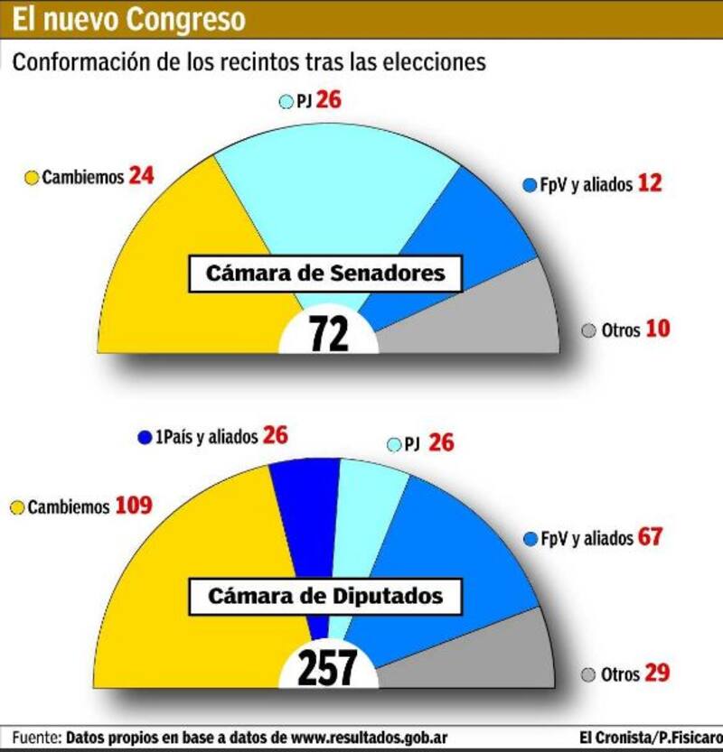 El Gobierno tendrá desde el 10 de diciembre un interbloque de, al menos, 109 legisladores propios en la Cámara de Diputados, al que podría sumar eventuales aliados, y un tercio del Senado a su favor, donde ocupará 24 asientos. De este modo, se confirma como la primera minoría en la cámara baja, con mayor representación, y el segundo bloque de la cámara alta. Bajo este escenario, Cambiemos tendrá que seguir buscando aliados para construir los consensos necesarios con los que impulsar las reformas que prevé debatir e instrumentar en el próximo año parlamentario.
