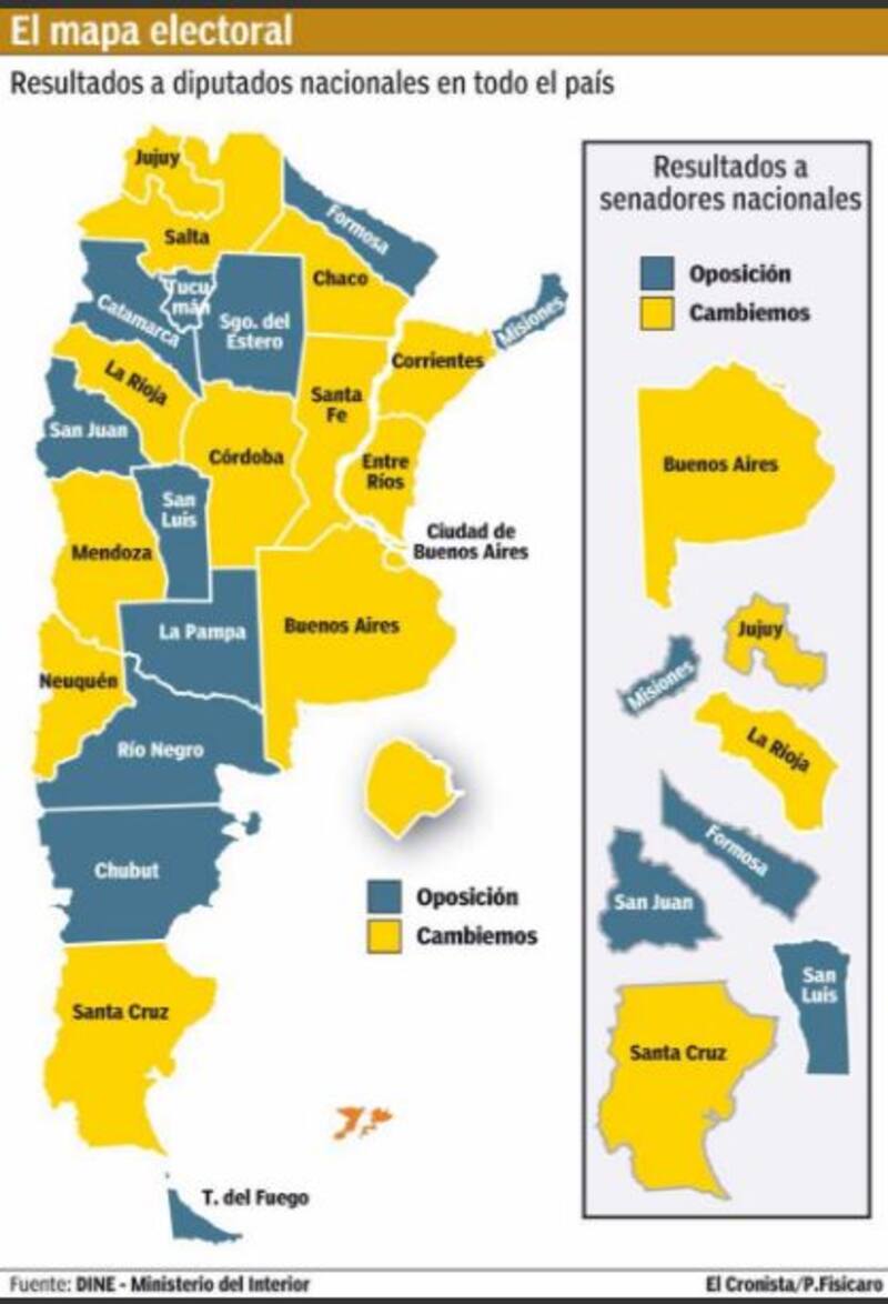 En la Cámara Alta, Cambiemos se quedó con una docena de bancas, la mitad de las que se ponían en juego. De su cosecha, retuvo tres bancas, y añadió otras nueve sillas: conquistó los dos escaños por la mayoría de las provincias de Buenos Aires, Jujuy, La Rioja y Santa Cruz, y las bancas por la minoría de Formosa, Misiones, San Juan y San Luis. El PJ y el FPV se quedaron con los otros 12 asientos.