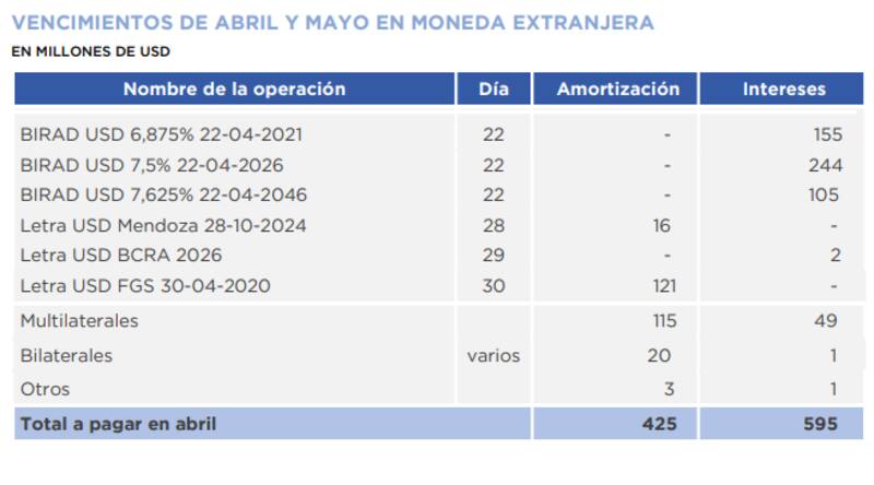 Este miércoles opera el pago de u$s 504 millones en intereses de tres bonos Birad (Bonos Internacionales de la República Argentina en Dólares), que al haber sido emitidos bajo legislación extranjera, sus vencimientos no fueron postergados hasta 2021.