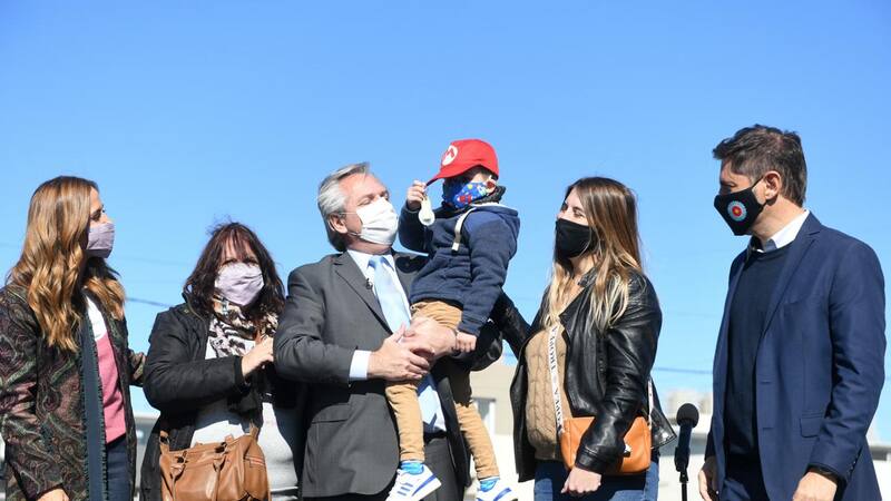 En el partido bonaerense de Merlo, Fernández entregó viviendas del Plan Procrear junto al ministro de Hábitat y Desarrollo Territorial, Jorge Ferraresi, y el titular de Obras Públicas, Gabriel Katopodis, entre otros, y destacó junto con Kicillof el rol de la obra pública en la dinamización de la economía para salir de la crisis económica que, en parte heredada, se acentuó en 2020 con las restricciones introducidas para frenar el avance del coronavirus.