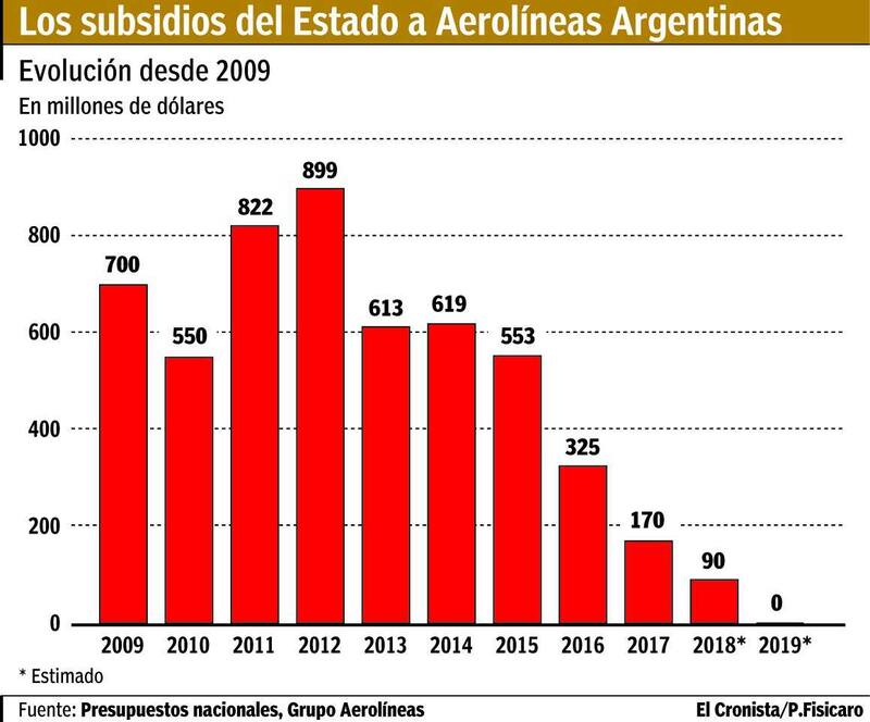 Desde que Aerolíneas Argentinas fue reestatizada en 2009 vivió diferentes procesos de ayuda. Durante el primer año fue subsidiada con u$s 700 millones y tuvo su pico en 2012 con u$s 899 millones.