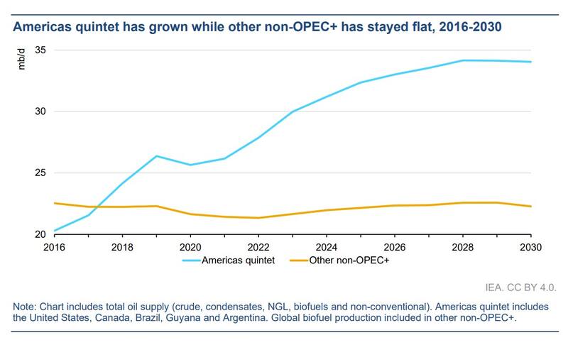 "Tras aumentos de hasta 11 millones de barriles diarios desde 2016, el quinteto aumentará la producción en otros 2,8 millones para 2030, con una producción combinada que se acerca a un tercio de la oferta mundial de petróleo", señala el reporte. Respecto a la Argentina, puntualiza que "el crecimiento de Vaca Muerta se verá impulsado por la nueva capacidad de extracción y la aplicación de las reformas económicas".