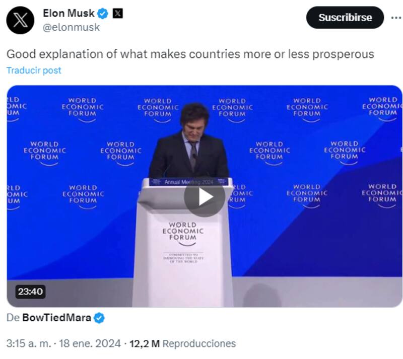 El dueño de la red social X compartió el discurso completo de Milei, con el audio de la traducción en simultáneo al idioma inglés, y agregó: "Buena explicación de lo que hace que los países sean más o menos prósperos".