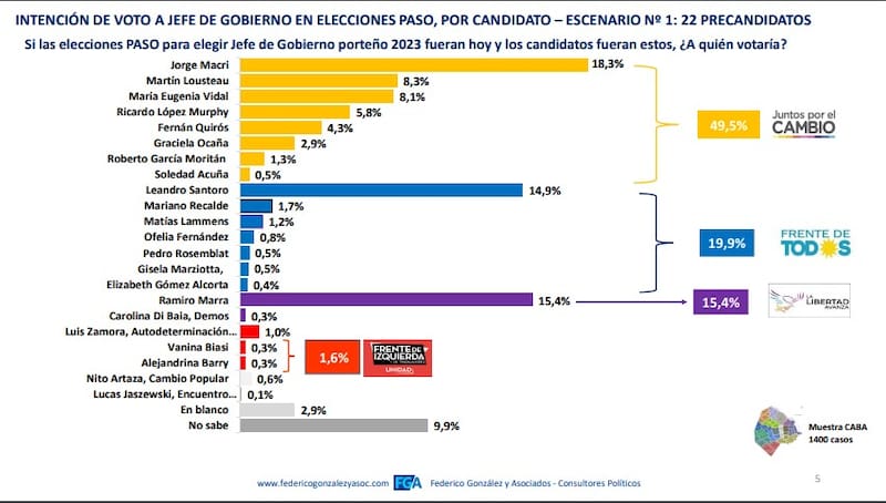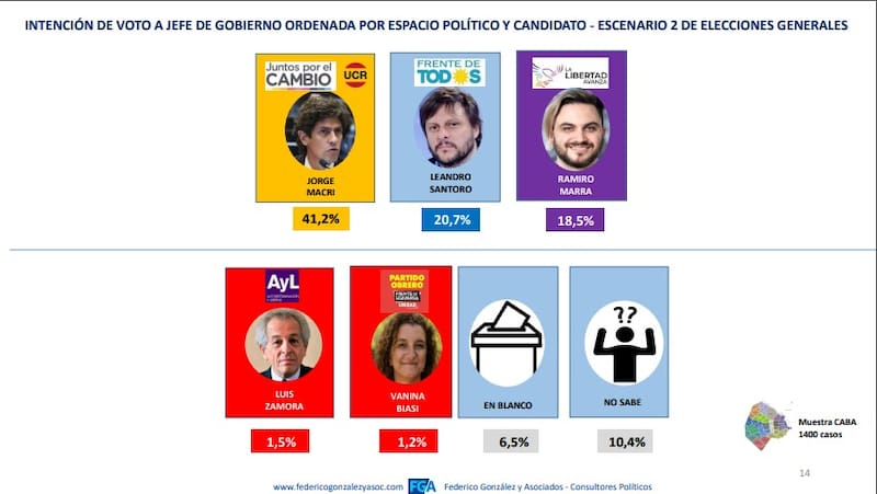 En todos los escenarios posibles Juntos por el Cambio se antepone a la figura en solitario de Ramiro Marra. Por otro lado, Leandro Santoro con un 20,2% de intencionalidad de voto resulta el candidato con mayor validación dentro del oficialismo, que se posiciona como segunda fuerza politica por detrás de La Livertad Avanza.