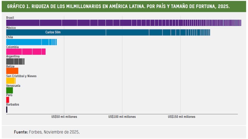 Entre los datos, señala que en noviembre de 2025 la región contaba con 109 multimillonarios (14 más que un año antes), con una fortuna conjunta de US$ 622.900 millones, una cifra que Oxfam compara con un monto “casi equivalente al PIB de Chile y Perú combinados”.