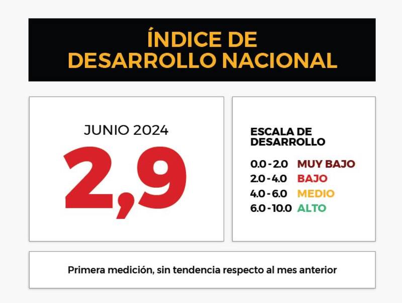 La presentación del informe de Fundación Pensar vino con la elaboración de un nuevo Índice de Desarrollo Nacional, conformado a partir de una ponderación de 50 indicadores diferentes, que será actualizado de forma mensual. Sin referencia de meses anteriores, el primer número de esta herramienta fue de 2,9 (bajo).