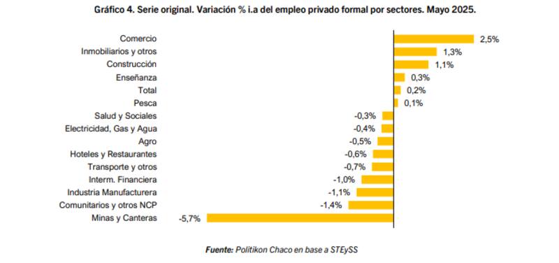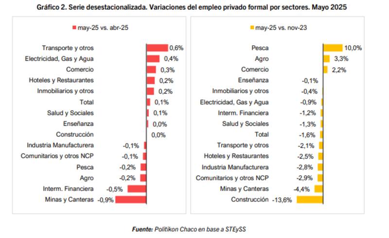 Sin embargo, si se compara los niveles de empleo de mayo 2025 respecto a noviembre del 2023, mes previo al cambio de gobierno, solamente tres sectores presentan alzas: Pesca (10,0%), Agricultura y Ganadería (3,3%) y Comercio (2,2%); entre el resto de los sectores, que muestran caídas, las más fuertes se observan en Explotación de Minas y Canteras (- 4,4%) y la Construcción (-13,6%).