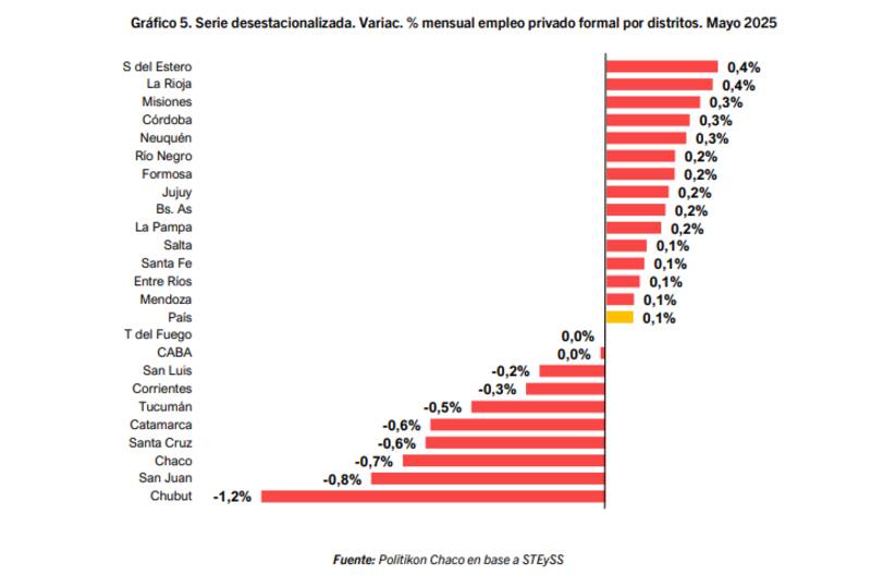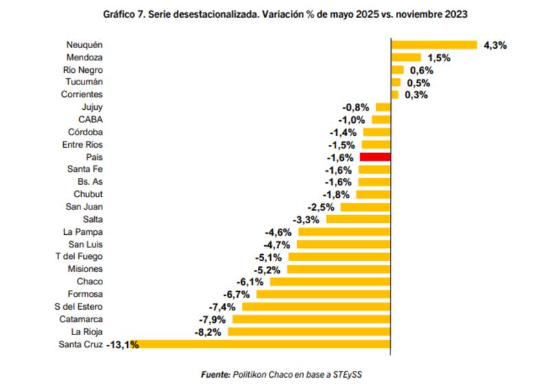 Entre las provincias, apenas cinco lograron en mayo 2025 superar los niveles de noviembre 2023: Neuquén con 4,3% (+6.151 empleos), Mendoza con 1,5% (+3.596), Río Negro con 0,6% (+682), Tucumán con 0,5% (+739) y Corrientes con 0,3% (+277).