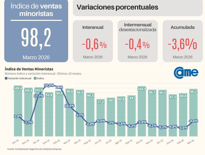 Con estos resultados, el indicador acumuló una caída del 3,6% en el primer trimestre de 2026, lo que refleja la debilidad del consumo sostenida a lo largo de los últimos meses. Desde CAME señalaron que “la pérdida de poder adquisitivo y el alza de los costos operativos afectaron al volumen general de ventas”.