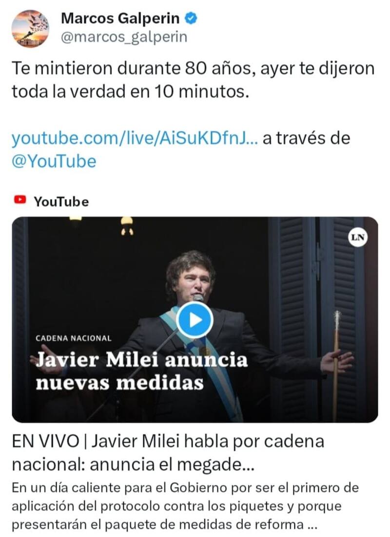 "Te mintieron durante 80 años. Ayer te dijeron toda la verdad en 10 minutos", sentenció Galperín.