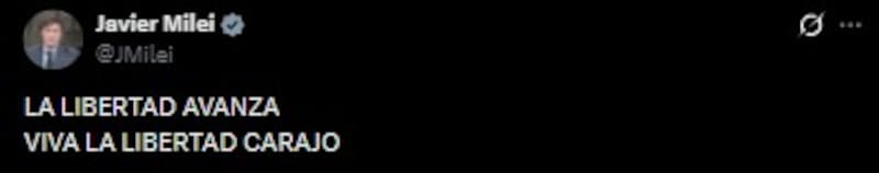 Javier Milei posteó: “PRINCIPIO DE REVELACIÓN. En días históricos como el de hoy podemos ver realmente de qué están hechos algunos dirigentes y formadores de opinión. De un lado está la democracia, la defensa de la vida, la libertad y la propiedad. Esos valores que muchos dicen defender pero sólo defienden cuando les queda cómodo. Del otro lado están aquellos cómplices de una dictadura narcoterrorista y sangrienta que ha sido un cáncer para nuestra región sembrando la enfermedad del Socialismo del Siglo XXI, con su consecuente miseria y muerte".