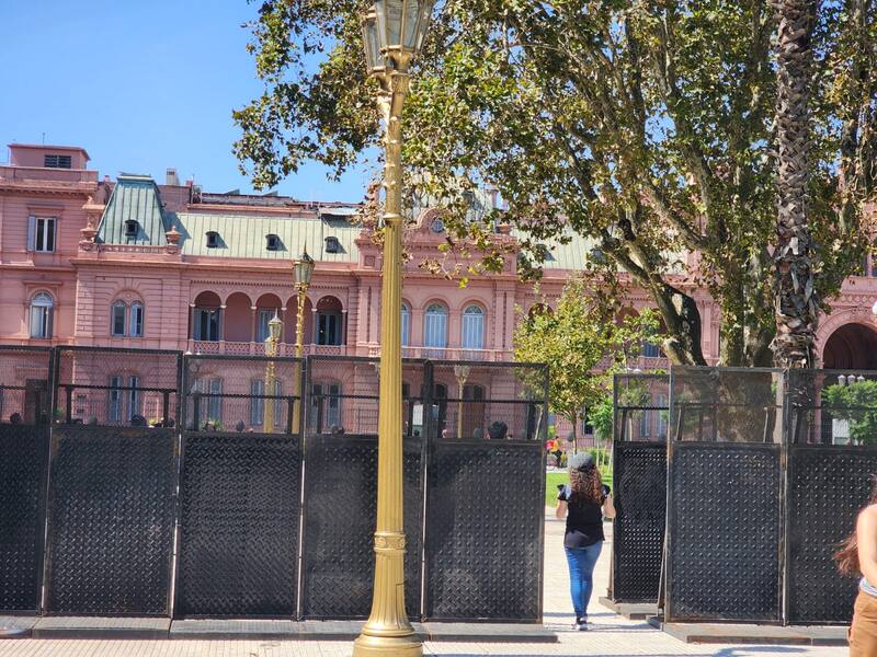 Eso mismo pasó la semana pasada, cuando cientos de manifestantes se apersonaron en la Plaza de Mayo y un puñado de ellos tiraron piedras hacia el edificio gubernamental. Otros se colgaron en las rejas del frontón delantero y colgaron banderas. "Acá no va a pasar nada ¿Sabés el arsenal que tenemos acá adentro?", le dijo a El Cronista un funcionario libertario que labura puertas adentro. Como medida preventiva, a 30 metros de la entrada principal se colocó un vallado que recorre toda la Plaza de Mayo para evitar que se acerquen integrantes de la marcha.