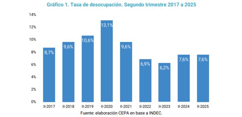 Los datos relevados a través de la EPH del INDEC para los 31 aglomerados urbanos muestran que, en el segundo trimestre del 2025, la tasa de desocupación ascendió a 7,6%, manteniendo el mismo nivel registrado en idéntico trimestre del año anterior.