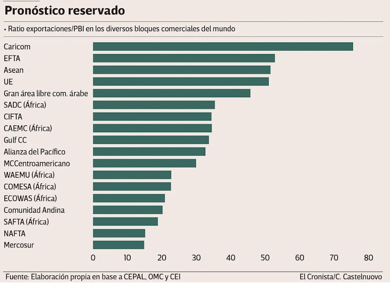 El último informe de la consultora Desarrollo de Negocios Internacionales (DNI) que dirige Marcelo Elizondo sostiene que el Mercosur es, de la veintena de acuerdos regionales de integración que existen en todo el mundo, el que menos relación exportaciones/PBI logra: menos de 15% contra más de 30% en el promedio mundial. Además, los niveles de arancelamiento externo de los cuatro países del bloque se encuentra por encima del 9,2 mundial, lo que eleva el costo para operar en comercio exterior.