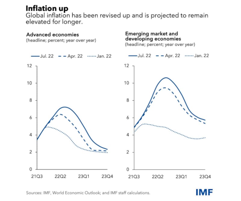A nivel global, el aumento de la inflación se materializa en los cálculos del FMI, que eleva los pronósticos en casi un punto a 8,3% para la inflación mundial este año y 5,7% el próximo. La suba de precios recién volvería a niveles pre pandémicos en 2024 y bajar la inflación será "más costoso de lo esperado" por el ajuste de política monetaria que podría impulsar a una recesión.