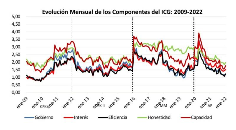 La variación del ICG respecto de diciembre fue positiva en sus cinco componentes: Honestidad de los funcionarios (1,98 puntos, 6,9%), Capacidad para resolver los problemas del país (1,77 puntos, 13,0%), Preocupación por el interés general (1,52 puntos, 5,1%), Eficiencia en la administración del gasto público (1,23 puntos, 14,4%) y Evaluación general del gobierno (1,22 puntos, 3,7%).