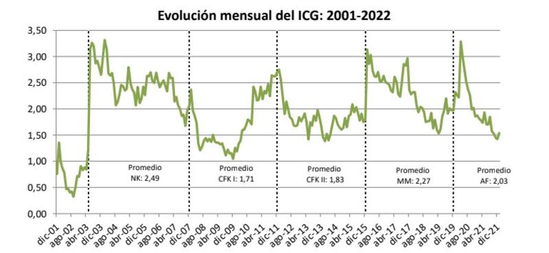 A pesar del aumento del ICG de enero, el índice se mantiene entre los valores más bajos registrados durante el gobierno de Alberto Fernández, apenas por encima de la peor medición registrada durante el gobierno de Mauricio Macri (abril de 2019 = 1,53).