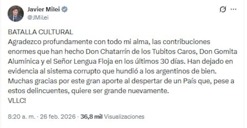 La acusación fue al estilo Milei, directa y sin filtros: con distintos apodos, señaló a los ejecutivos por haber “dejado en evidencia al sistema corrupto” que, según su visión, imperó en la economía argentina durante las últimas décadas.