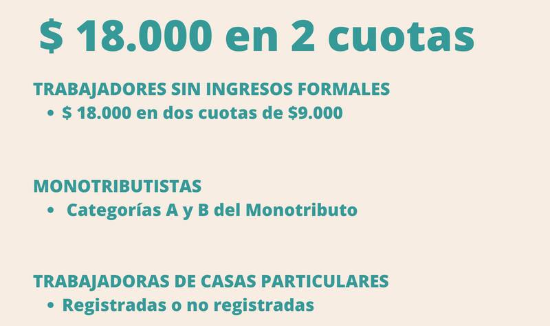 Los trabajadores informales que cobran hasta dos salarios mínimos, o sea $ 77.880 y monotributistas de la categoría A y B recibirán un bono de $18.000 en dos cuotas.
