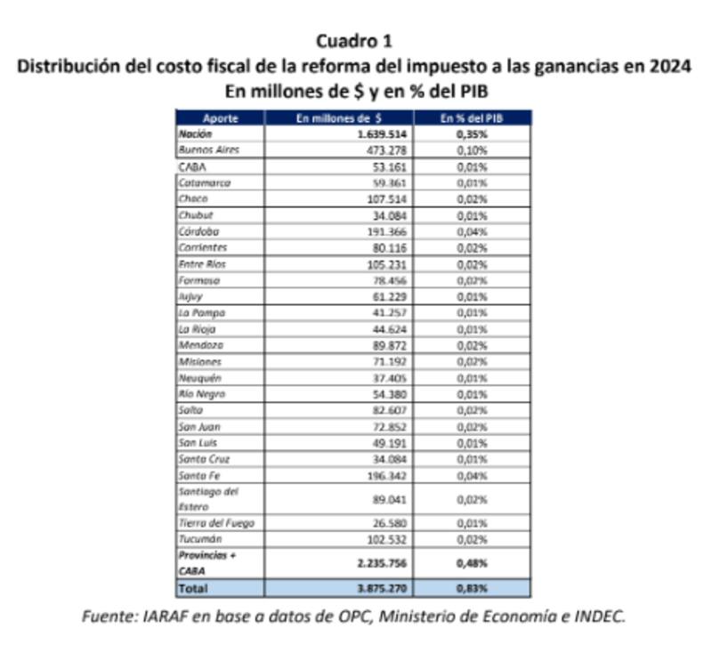 Según los cálculos del Instituto Argentino de Análisis Fiscal (IARAF), la elevación del piso de Ganancias tendría un costo de $3.875.000 millones (0,8% del Producto Bruto Interno). De los cuales, $473.278 millones (0,10%) caerían sobre la provincia en manos de Axel Kicillof.